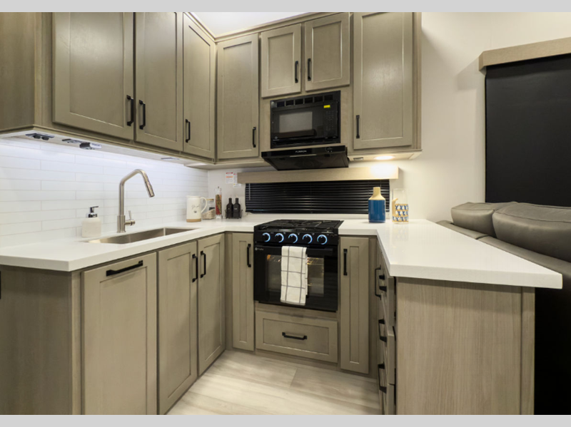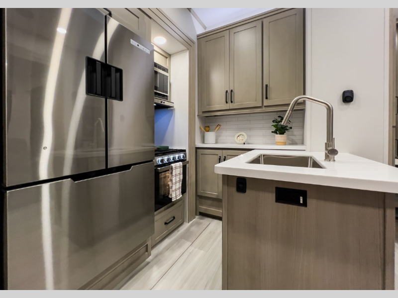 Each model also includes a universal docking center, a fiberglass front cap with paint and LED lighting, a heated and enclosed underbelly for four seasons of traveling, and a dovetail rear end. The Momentum G-Class also comes with large panoramic windows, residential cabinetry, motion-sensor lighting, and stainless steel-accented appliances. The fun will not stop when listening to the exterior speakers, and the awning with LED lighting will create an outdoor living space you are sure to love.