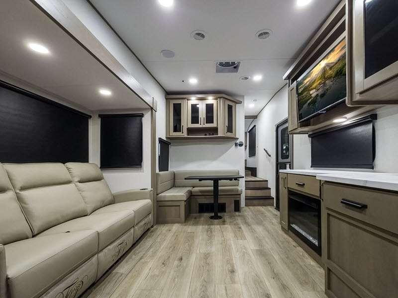Each fifth wheel has 90-degre turning radius capabilities which allows you to be comfortable driving in town and parking into your campsite. Some construction and Arctic 4-Seasons Protection package features include a one-piece TPO roof membrane, a heated and enclosed underbelly with circulating heat, 12V heat pads on the holding tanks, and a heated pass-through storage area so you can travel and enjoy any climate. The interior offers large panoramic slide room windows for great views, premium Congoleum flooring for durability, and an On Demand water heater.