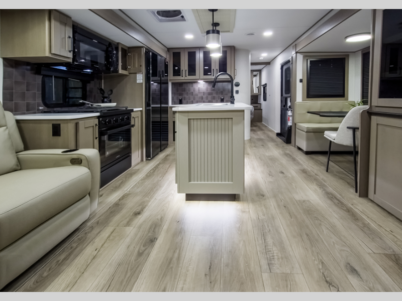 Reflection is built with the Arctic 4-Season Protection package which provides a 35K BTU high-capacity furnace, double insulated roof and front cap, a heated and underbelly with circulating heat, and 12V heat pads on the holding tanks to mention a few features that allow you to travel during any climate. The interior offers residential cabinetry, a deep-seated stainless-steel kitchen sink in the gourmet kitchen, a spacious shower with a glass door, and ductless flooring in the living area to name a few comforts.