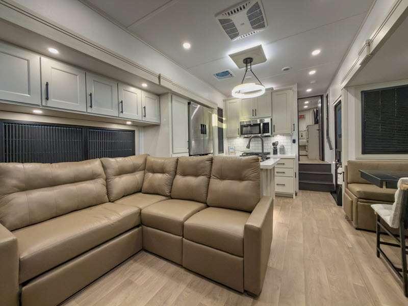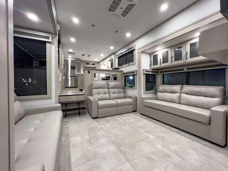 Sleeps 6 Slides 5 Length 41 ft 4 in Ext Width 8 ft 5 in Ext Height 13 ft 5 in Int Height 8 ft 1 in Exterior Color Standard Graphics or Aurora, Midnight, Pearl Full-Body Paint Options Hitch Weight 3052 lbs GVWR 19000 lbs Dry Weight 15200 lbs Fresh Water Capacity 81 gals Grey Water Capacity 106 gals Black Water Capacity 53 gals Tire Size ST215/75R 17.5 LRH Furnace BTU 35000 btu Available Beds Queen Refrigerator Type Stainless Steel Refrigerator Size 20 cu ft Cooktop Burners 4 Shower Size 48" x 30" Number of Awnings 2 Axle Weight 8000 lbs LP Tank Capacity 30 lbs. Water Heater Type Tankless On Demand AC BTU 30000 btu TV Info LR LED Telescoping Smart TV Awning Info 14' 5" and 15' 5" Power w/Integrated LED Lighting Axle Count 2 Washer/Dryer Available Yes Number of LP Tanks 2 Shower Type Shower w/Seat Electrical Service 50 amp Similar Floorplans