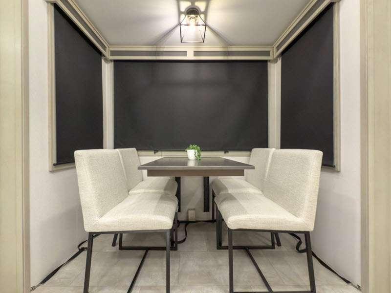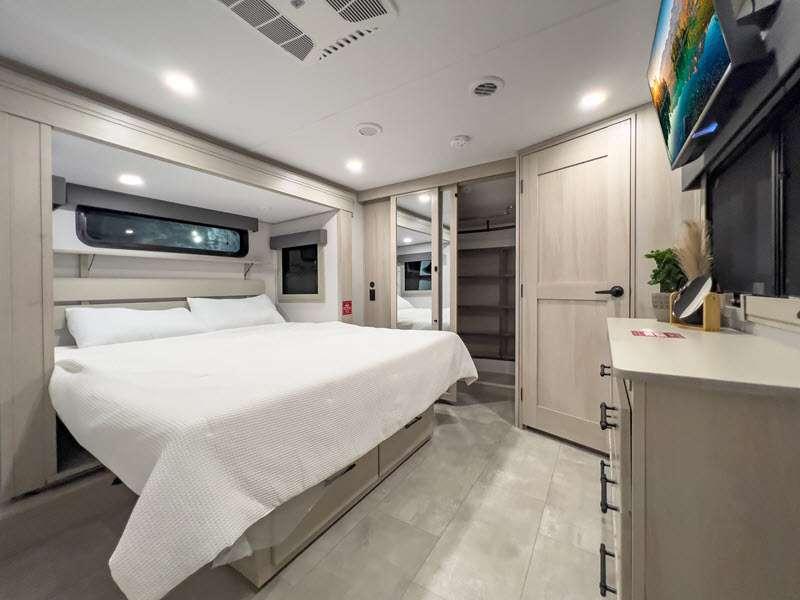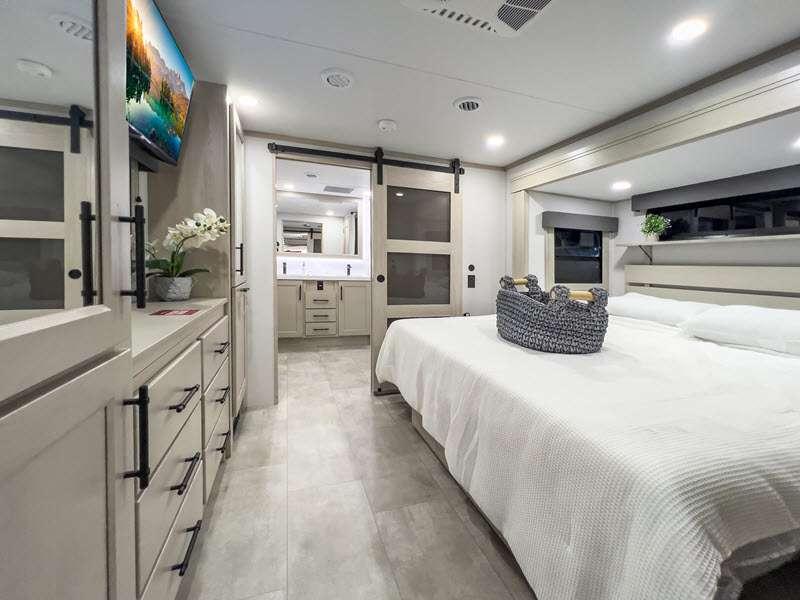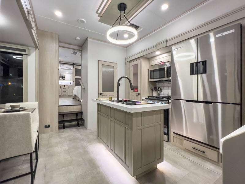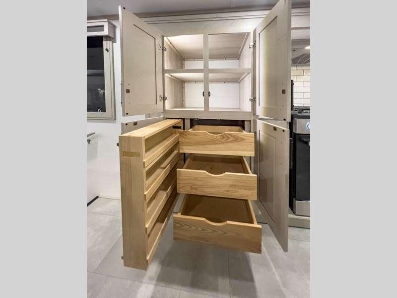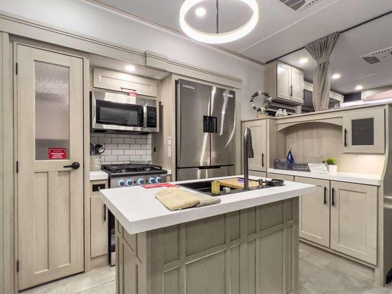 Each is built on a 101" wide body drop-frame super chassis, and includes the MORryde pin box system that utilizes a unique rubber shear spring to positively deal with rough towing and road shock. Some standard features that stand out include the chef-inspired professional grade stainless steel cooktop and Smart sink with a removeable cutting board, produce strainer and glass rinser, and the on-demand water heater with a whole house water filtration system. There is also an all-in-one enclosed and heated utility center to enjoy four seasons of camping, plus many more comforts.