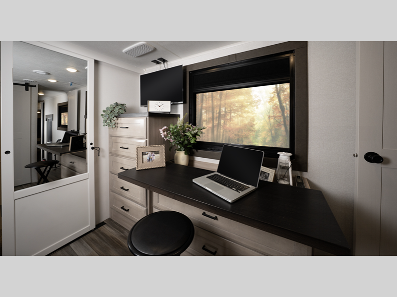 They come equipped with an impressive three 15,000 BTU A/C with quiet residential return air and a mandatory Four Seasons Package that will ensure your comfort year around, plus there are stainless steel kitchen appliances that give a residential touch to your space. The durable construction that includes a PVC roofing membrane will help extend the life of your fifth wheel, and the TravelLINK command system will put you in control of lighting, heating, and cooling for added convenience.