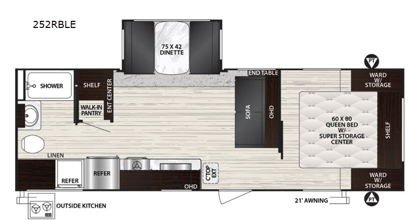 You'll want to take this travel trailer to the lake every other weekend and since it includes a slide out, space will be no worry at all. Set up camp, then have a look around the campground to stretch your legs. When you return, you can prepare lunch on the outside kitchen while the kids set the picnic table. This model also includes a three burner cooktop and a microwave oven inside as well to prepare meals and the chef of the family will appreciate the walk-in pantry for paper goods and snacks. In the evening, the kids can play a game of cards at the booth dinette while you and your spouse relax on the sofa. When it's finally time to call it a night, the front private bedroom with a queen bed will provide a great night's rest and the kids can convert the furniture for sleeping space.